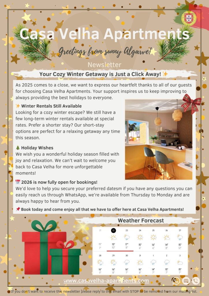 Das Jahr neigt sich dem Ende zu und wir möchten Ihnen einen wunderschönen Silvesterabend und alles Gute für das kommende Jahr wünschen. Wir hoffen, Sie 2026 wieder in den Casa Velha Apartments begrüßen zu dürfen! Wir sehen uns an der Algarve ☀️ Ihr Team von Casa Velha Apartments